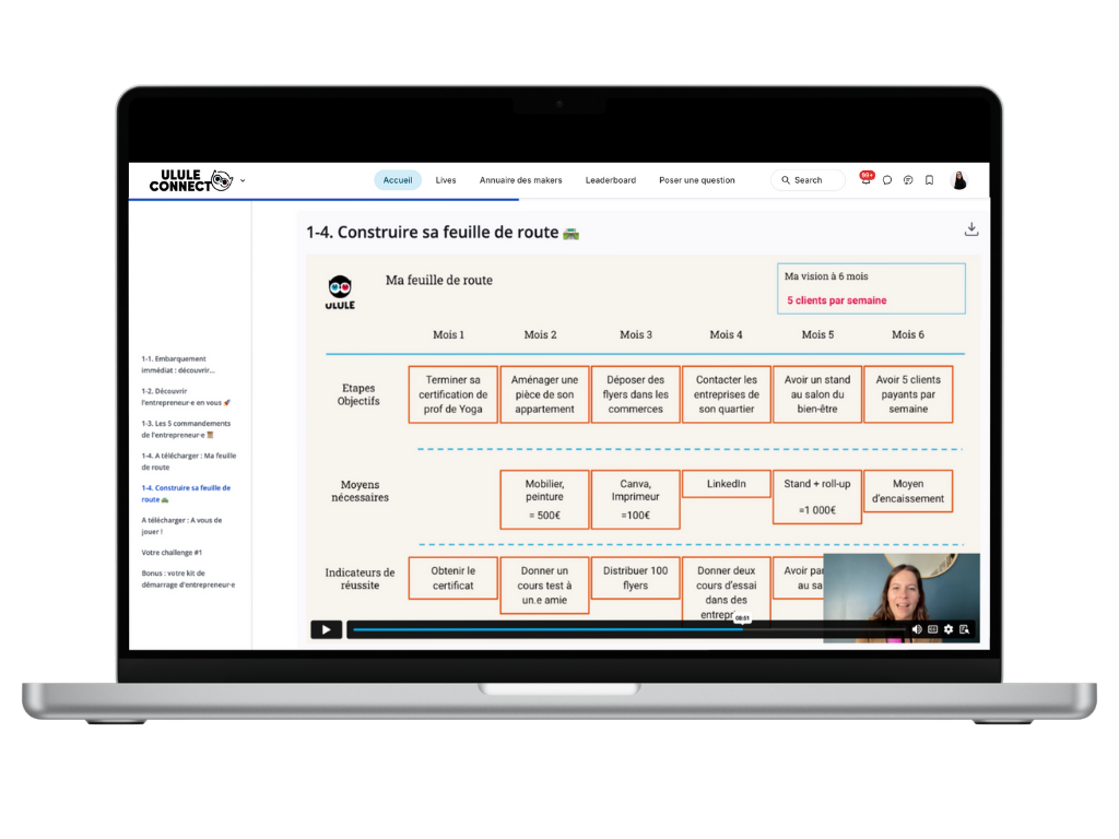 Progressez étape par étape pour donner des ailes à votre projet. À chaque module, des mises en application concrètes vous permettent d’avancer solo ou avec votre coach.